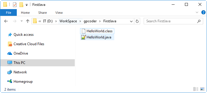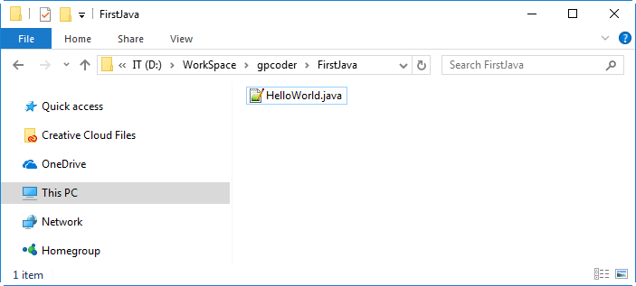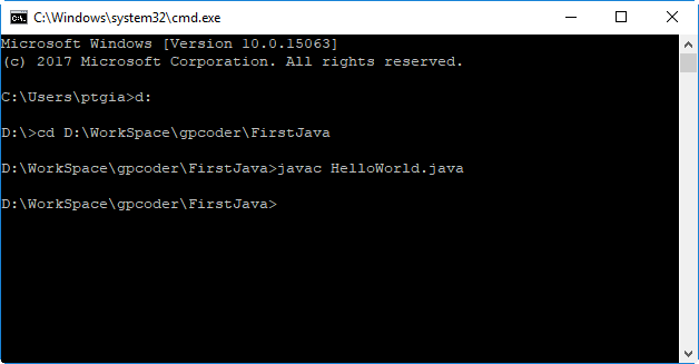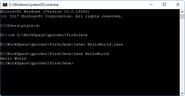 Ở đây giả sử file HelloWorld.java được lưu trong thư mục D:\WorkSpace\gpcoder\FirstJava.