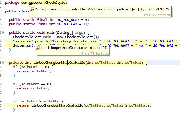 Ví dụ: kiểm tra checkstyle với đoạn code bên dưới