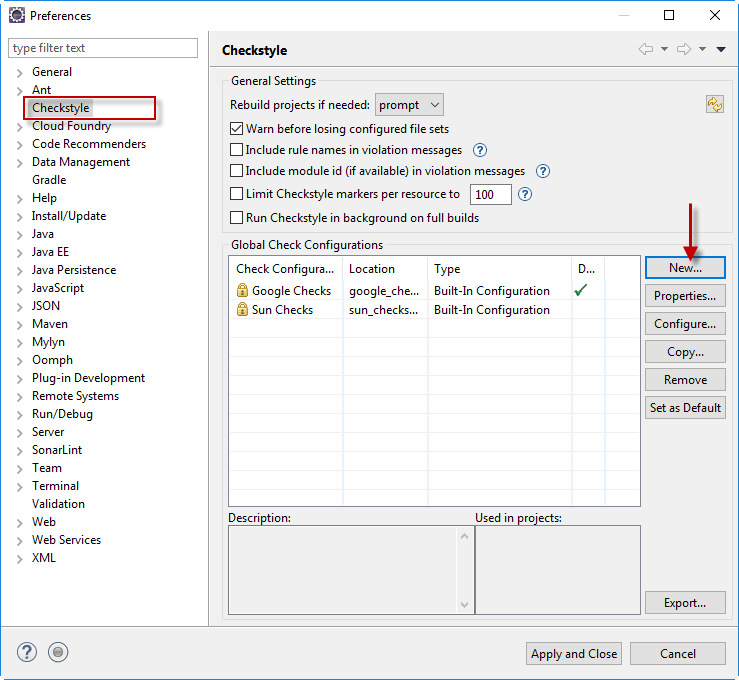 Vào menu Window -> Preferences -> CheckStyle.