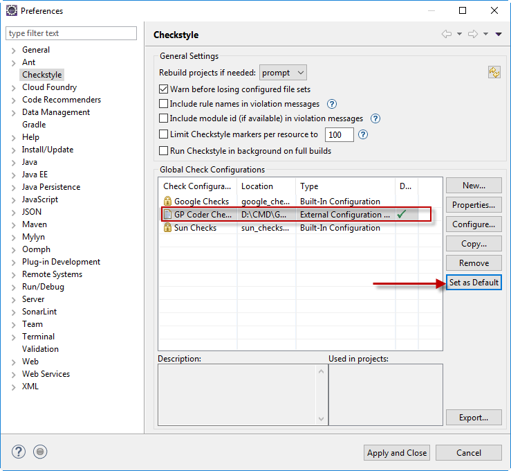 Sau đó chọn Set as Default để áp dụng bộ quy tắc này cho các project trong Eclipse workspace hiện tại