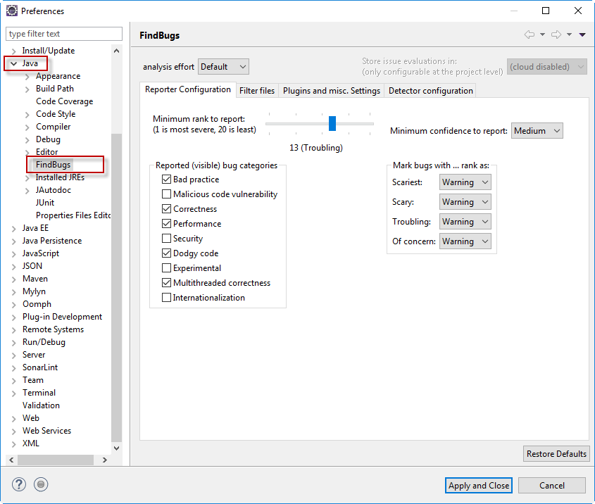 Đặt thứ hạng tối thiểu để báo cáo là 20 (Of concern). Điều này sẽ cho phép chúng ta xem tất cả lỗi từ kết quả đánh giá của FindBugs.