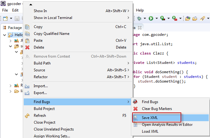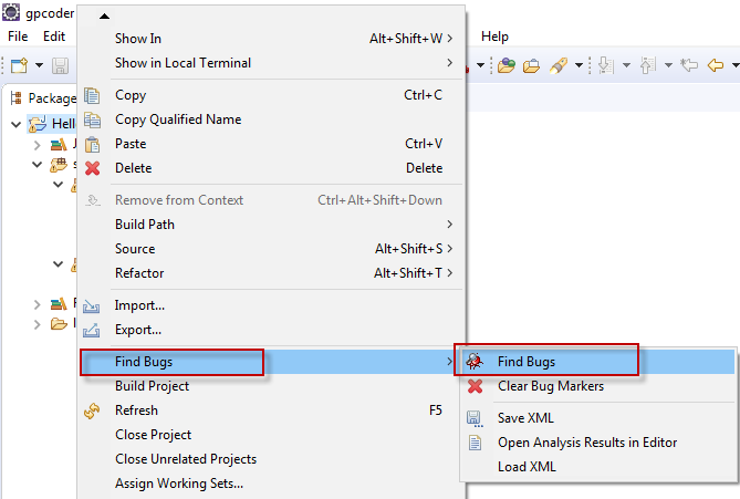 Để chạy phân tích lỗi của FindBugs trong một project, nhấp chuột phải vào project và chọn Find Bugs … -> Find Bugs.