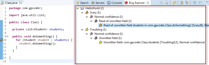 Như hình trên: Findbugs chỉ cho chúng ta ở dòng 10, có thể bị lỗi do chưa gán trị cho field students, fix lại bằng cách check trước khi sử dụng, hoặc khởi tạo giá trị.