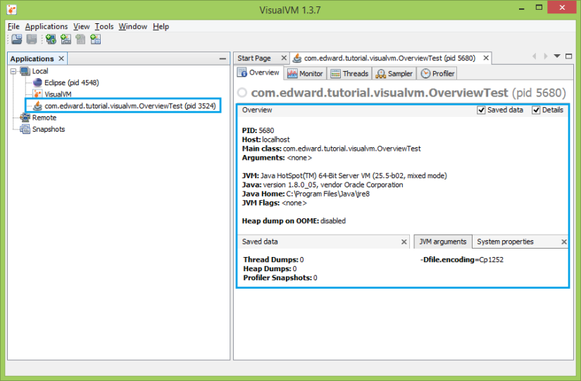 Sau khi run đoạn code trên, các bạn chuyển qua VisualVM sẽ thấy được 1 process Java tương ứng với đoạn chương trình trên, double click vào sẽ thấy được thông tin overview về chương trình như: Process ID, main class, argument, phiên bản Java đang dùng…
