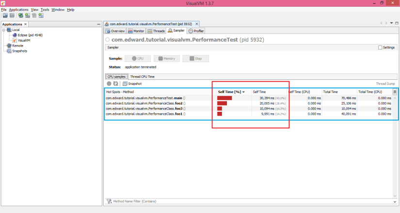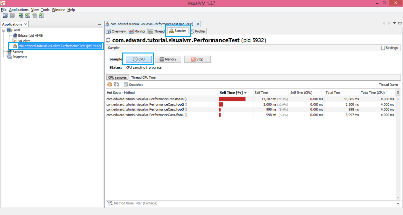 Sau khi run chương trình, các bạn chuyển qua VisualVM, tìm process của chương trình đang chạy và double click vào, chọn thẻ Sampler và chọn button CPU, nó sẽ ra như sau: