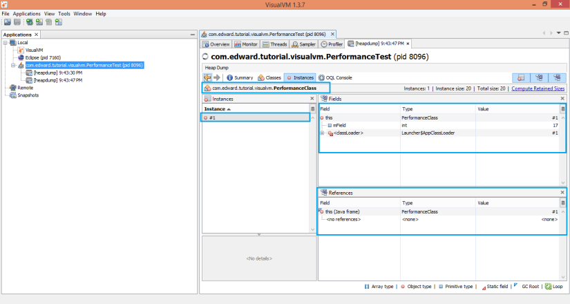 Bên cạnh chức năng theo dõi memory trực quan này, VisualVM còn hỗ trợ chúng ta xem HeapDump của chương trình đang chạy ngay thời điểm hiện tại. HeapDump sẽ cung cấp cho chúng ta nhiều thông tin hơn về giá trị của các biến thành viên trong instance đó. Để load HeadDump của chương trình hiện tại, các bạn click phải vào process của chương trình, sau đó chọn HeapDump, 1 tab HeapDump mới sẽ mở ra, các bạn chọn qua nút Classes. Tại đây các bạn có thể double click vào 1 class nào đó sẽ hiển ra danh sách các instance của lớp đó, double click vào 1 đối tượng, bạn sẽ thấy thông tin về các field của nó và danh sách các đối tượng khác đang reference đến nó.