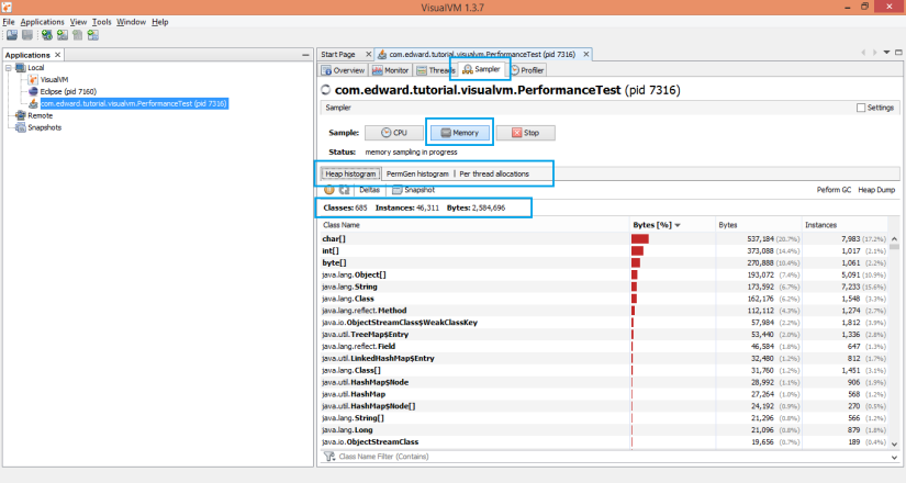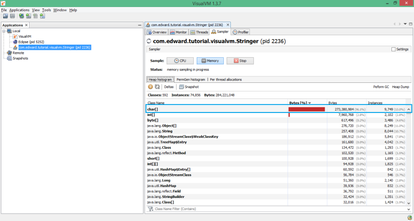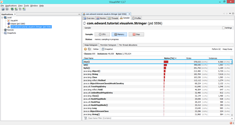 Cùng đoạn code như trên, khi các bạn chạy chương trình Java và chuyển sang VisualVM, chọn thẻ Sampler và chọn button Memory, nó sẽ ra như sau: