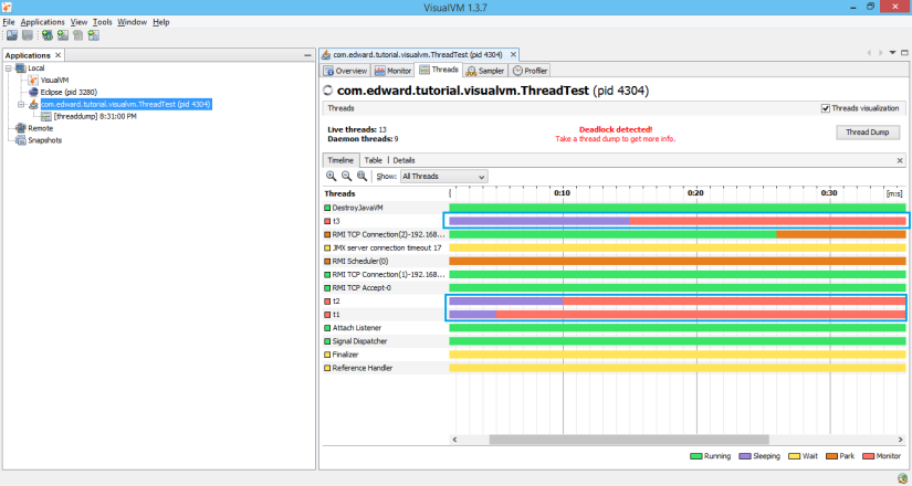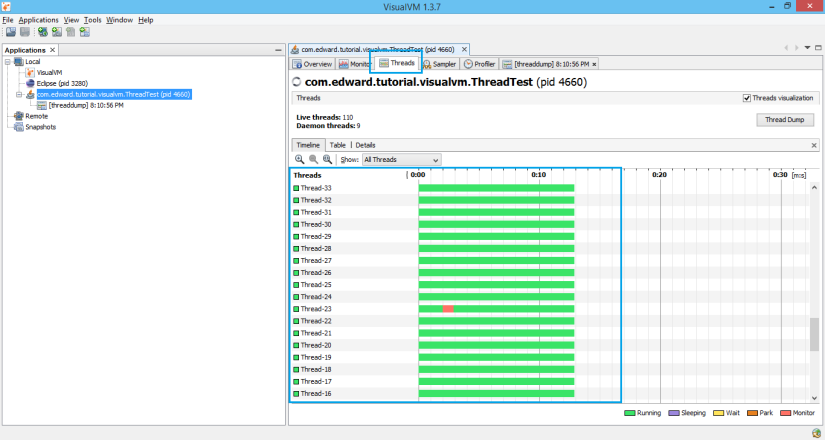 VisualVM cũng hỗ trợ việc theo dõi một cách trực quan về vòng đời của tất cả các thread đang chạy trong chương trình. Với mỗi trạng thái của Thread sẽ được biểu diễn bằng một màu khác nhau, bạn sẽ dễ dàng hình dung ra mọi thứ đang hoạt động thế nào. Bắt đầu với 1 đoạn code test.