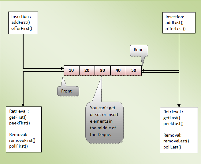 Deque Interface cung cấp các phương thức cần thiết để bạn có thể chèn, truy xuất và loại bỏ các phần tử khỏi cả hai đầu.