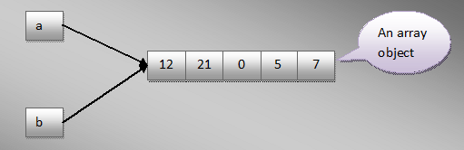 Trong ví dụ trên, chúng ta đang khai báo một mảng kiểu int. Chúng ta sao chép mảng đó sang mảng khác kiểu int. Bạn có thể nhận thấy rằng, việc thay đổi giá trị của một mảng sẽ được phản ánh trong một mảng gốc nữa. Có nghĩa là cả hai biến mảng (a và b) đều trỏ đến cùng một đối tượng trong bộ nhớ. Điều này có thể được minh họa bằng sơ đồ dưới đây: