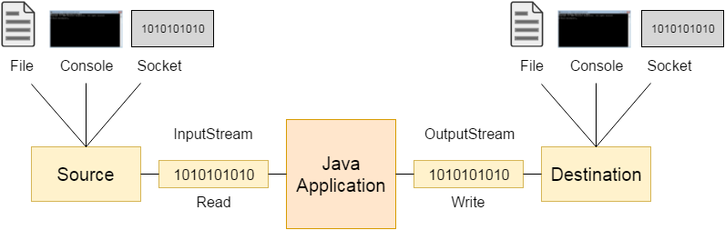 Đối với Java, các thiết bị chỉ nhập như bàn phím sẽ có Stream nhập nối với nó, các thiết bị chỉ xuất như màn hình sẽ có Stream xuất nối với nó, các thiết bị như đĩa từ sẽ có cả 2 Stream nhập và Stream xuất nối với nó.