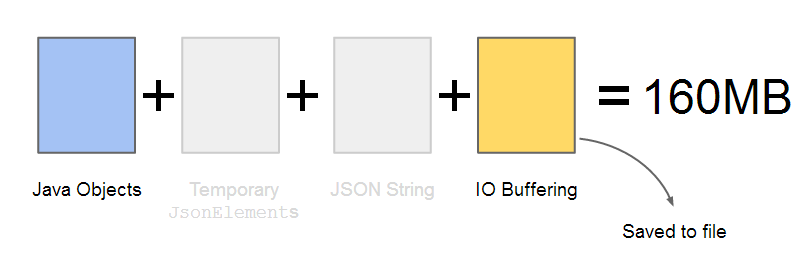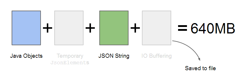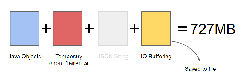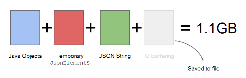 Với JsonSerializer và JsonDeserializer cung cấp đệm an toàn rất tiện lợi vì nó làm giảm nguy cơ tạo chuỗi JSON không hợp lệ. Hình ảnh được hiển thị ở trên cho thấy cách các đối tượng được tuần tự hóa bằng cách sử dụng JsonSerializer. Đầu tiên các đối tượng Java được chuyển sang JsonElements, và sau đó chuyển sang chuỗi JSON. Quá trình này tạo ra một tập hợp các đối tượng tạm thời, sau đó được chuyển đổi thành chuỗi JSON. Các đối tượng này được chuyển thành chuỗi JSON sử dụng một thực hiện nội bộ của TypeAdapter. TypeAdapter có thể lấy bất kỳ đối tượng Java (bao gồm các đối tượng thuộc kiểu JsonElement) và chuyển nó sang chuỗi JSON như thể hiện trong hình dưới đây: